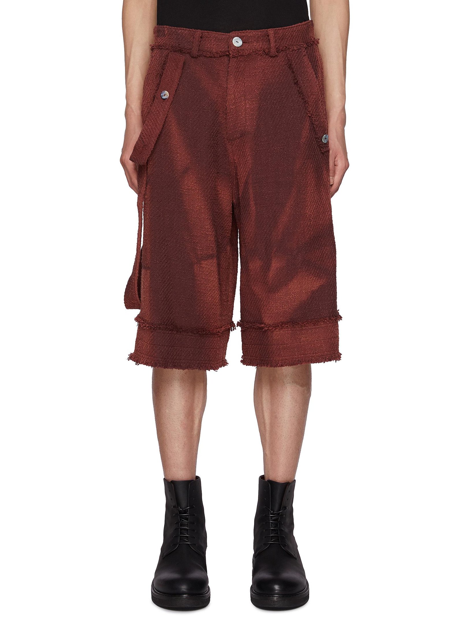 ‘s shorts are a bold statement in texture and color, featuring a rich, rust hue with a distinctive frayed hem. The unique fabric and oversized pockets add a touch of edge, perfect for styling with boots for an urban, rugged look.